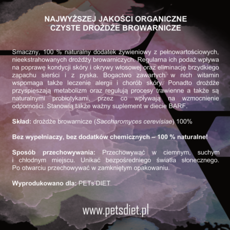 Smaczny, 100 % naturalny dodatek żywieniowy z pełnowartościowych, nieekstrahowanych drożdży browarniczych. Regularna ich podaż wpływa na poprawę kondycji skóry i okrywy włosowej oraz eliminację brzydkiego zapachu sierści i z pyska. Bogactwo zawartych w nich witamin wspomaga także leczenie alergii i chorób skóry. Ponadto drożdże przyspieszają metabolizm oraz regulują procesy trawienne a także są naturalnymi probiotykami, przez co wpływają na wzmocnienie odporności. Stanowią także ważny suplement w diecie BARF.