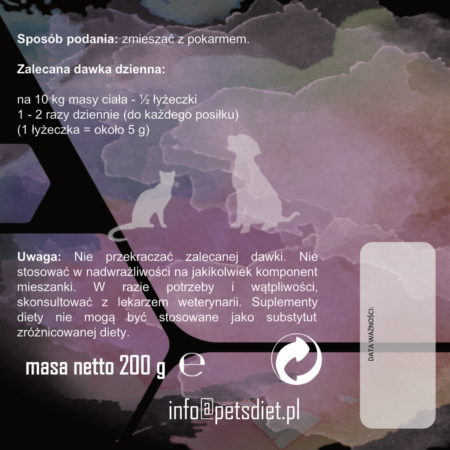 Uwaga: Nie przekraczać zalecanej dawki. Nie stosować w nadwrażliwości na jakikolwiek komponent mieszanki. W razie potrzeby i wątpliwości, skonsultować z lekarzem weterynarii. Suplementy diety nie mogą być stosowane jako substytut zróżnicowanej diety.