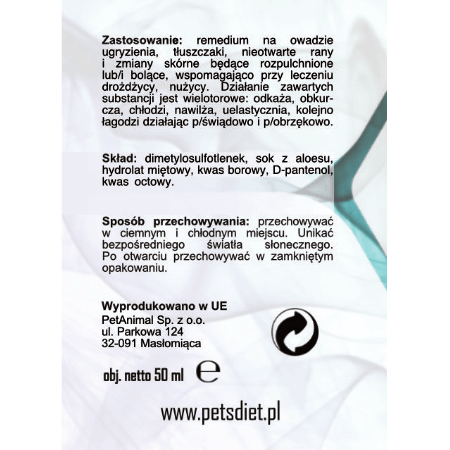 Zastosowanie: remedium na owadzie ugryzienia, tłuszczaki, nieotwarte rany i zmiany skórne będące rozpulchnione lub/i bolące, wspomagająco przy leczeniu drożdżycy, nużycy. Działanie zawartych substancji jest wielotorowe: odkaża, obkurcza, chłodzi, nawilża, uelastycznia, kolejno łagodzi działając p/świądowo i p/obrzękowo.