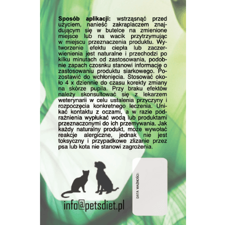 Sposób aplikacji: wstrząsnąć przed użyciem, nanieść zakraplaczem znajdującym się w butelce na zmienione miejsce lub na wacik przytrzymując w miejscu przeznaczenia produktu. Wytworzenie efektu ciepła lub zaczerwienienia jest naturalne i przechodzi po kilku minutach od zastosowania, podobnie zapach czosnku stanowi informację o zastosowaniu produktu siarkowego. Pozostawić do wchłonięcia. Stosować około 4 x dziennie do czasu korekty zmiany na skórze pupila. Przy braku efektów należy skonsultować się z lekarzem weterynarii w celu ustalenia przyczyny i rozpoczęcia konkretnego leczenia. Unikać kontaktu z oczami, a w razie podrażnienia wypłukać wodą lub produktami przeznaczonymi do ich przemywania. Jak każdy naturalny produkt, może wywołać reakcje alergiczne, jednak nie jest toksyczny i przypadkowe zlizanie przez psa lub kota nie stanowi zagrożenia.