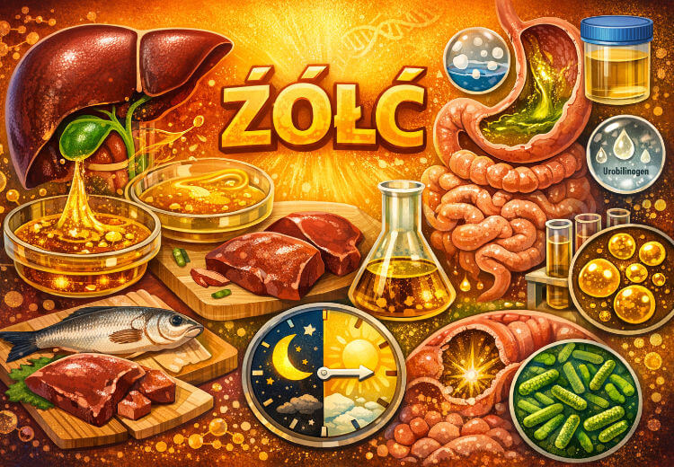 Jak sama nazwa wskazuje – tak. Ma →odczyn obojętny – do zasadowego (7-8pH), jest gorzka, o czym możemy się przekonać, gdy ktoś miał wątpliwą przyjemność doświadczyć refluksu żółciowego, albo gdy nieprawidłowo oprawimy rybę, czy kiedy przewody żółciowe pozostaną na wątróbce to nawet obróbka termiczna na niewiele się zda. Stąd nasze babcie moczyły wątrobę w mleku, by gorzkość zastąpić cukrem mlecznym i doprowadzić do rozkładu żółci. Piszemy o tym nie dla samej hecy, ale dlatego by zwizualizować jej ogromną moc. Charakteryzuje się kolorem intensywnym; nawet lekko pomarańczowym, a zawdzięcza to barwnikowi – bilirubinie powstającej z metabolizowanej hemoglobiny, której spora ilość występuje we krwi magazynowanej w hepatocytach, które to tworzą strukturę wątroby. Przemiana dzięki bakteriom jelitowym bilirubiny objawia się w moczu pod postacią przezroczystawego już – urobilinogenu. Czyli kolor żółty jako żółć, nie pojawi się w moczu. Aczkolwiek obrazem nieprawidłowości →”złotej trójcy” do jakiej należy wątroba, trzustka, pęcherzyk żółciowy – będą obecne krople lipidowe.